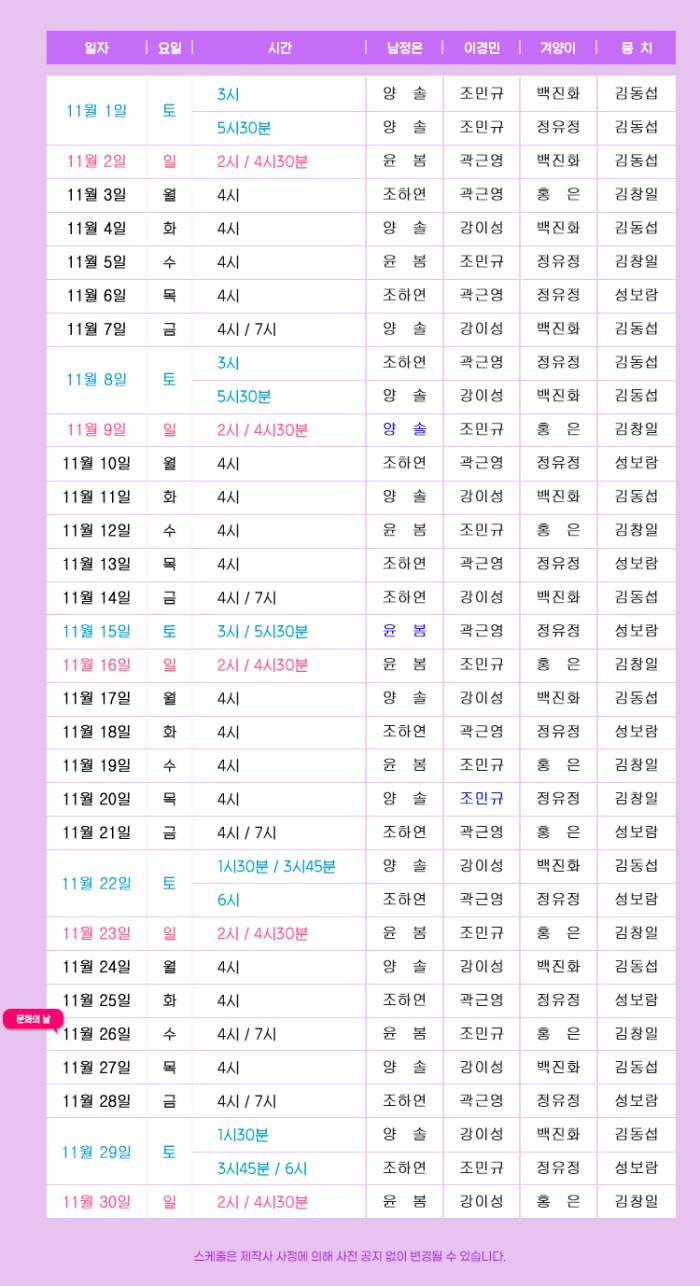 - 월~목 오후 4시 / 금 4시, 7시 / 토 3시, 5시30분 / 일 2시, 4시30분