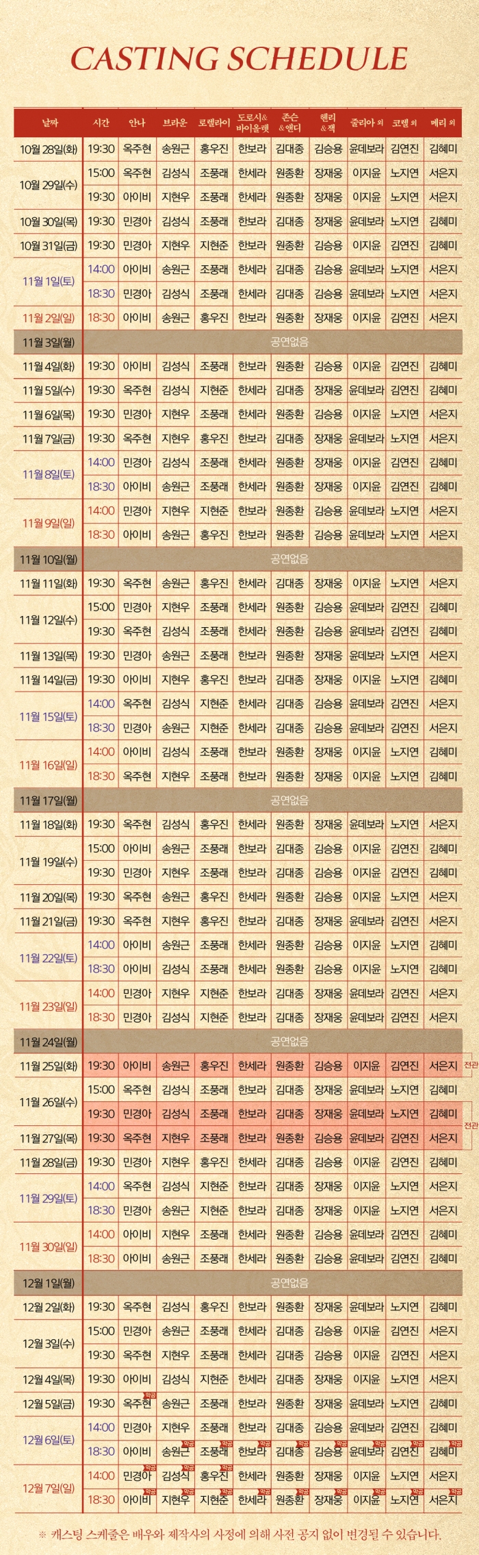 - 화, 목, 금 오후 7시30분 / 수 3시, 7시30분 / 주말, 공휴일 2시, 6시30분 (월 공연 없음)