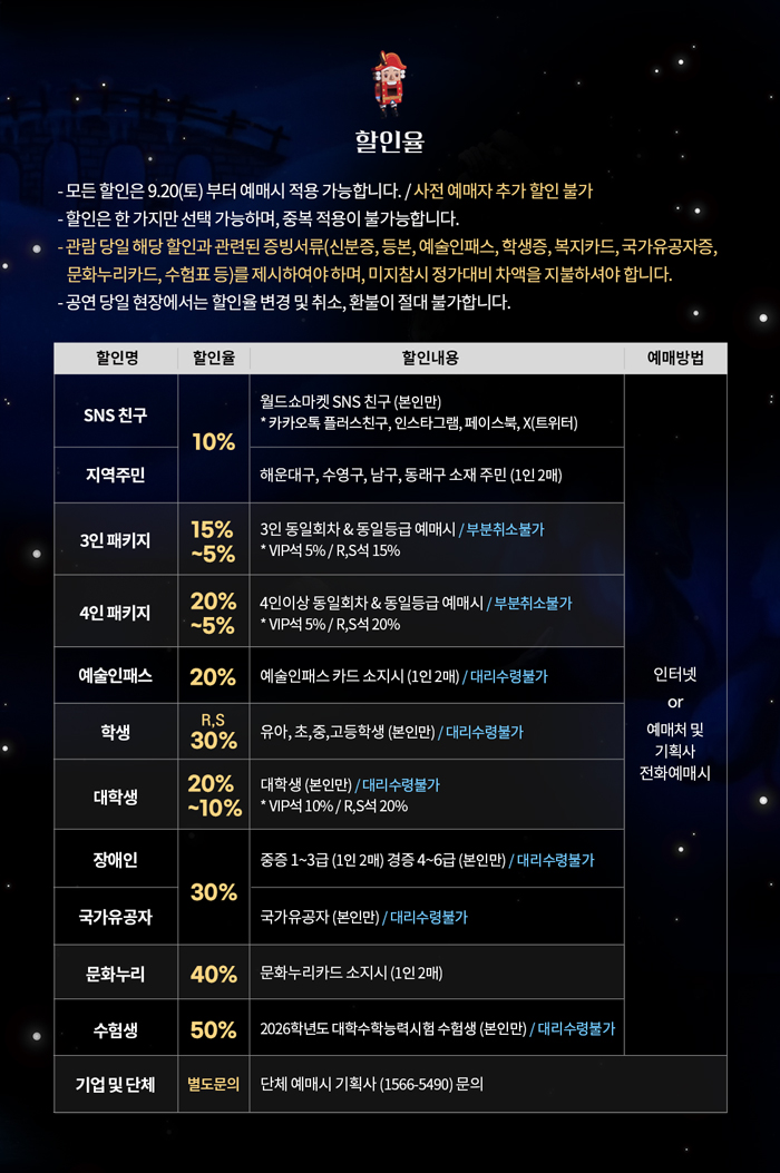 ※ 휠체어석은 기획사 전화예매만 가능합니다. (1566-5490)