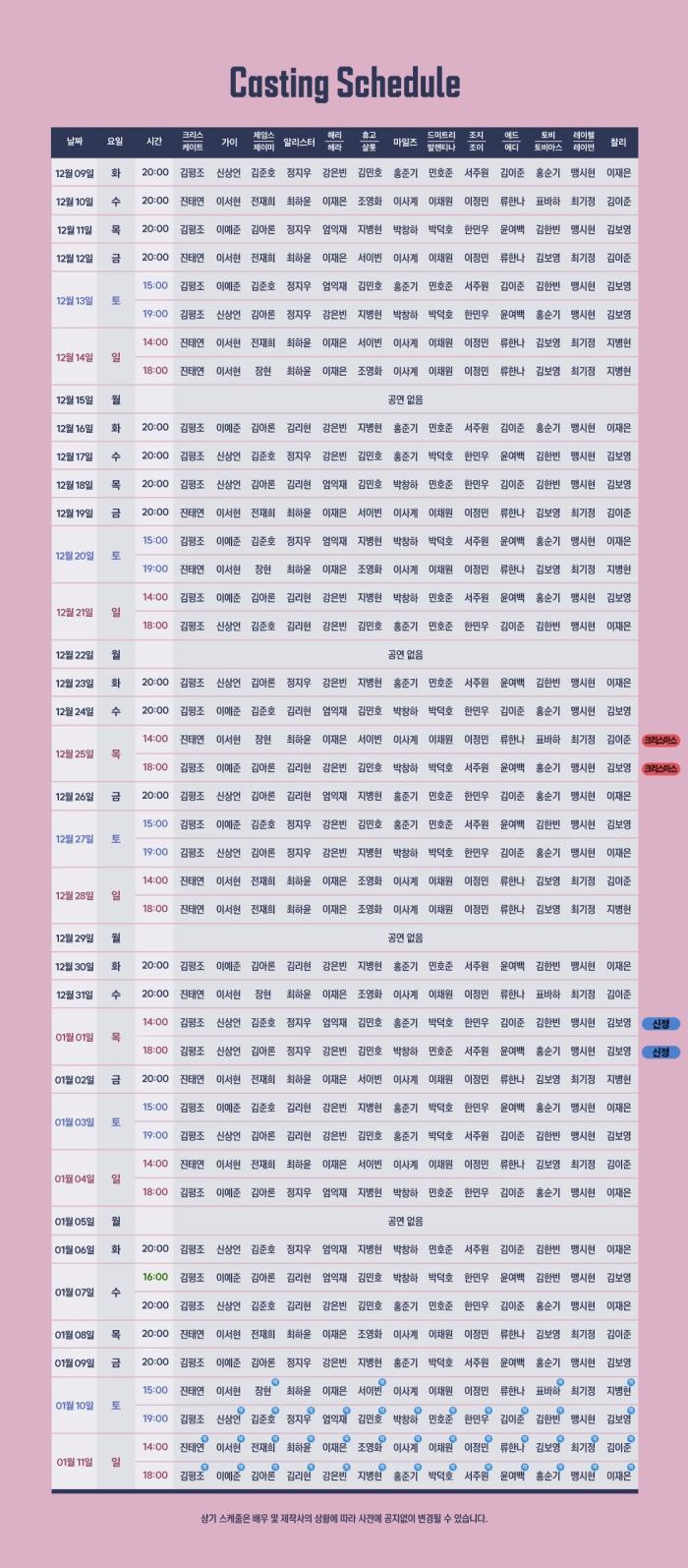 - 평일 오후 8시 / 토 3시, 7시 / 일, 공휴일 2시, 6시 (월 공연없음)