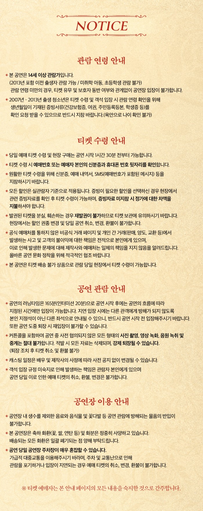 ※ 좌석배정은 회차별로 상이하며 당일 잔여석에서 예매 선착순으로 배정됩니다. (좌석 지정 불가)