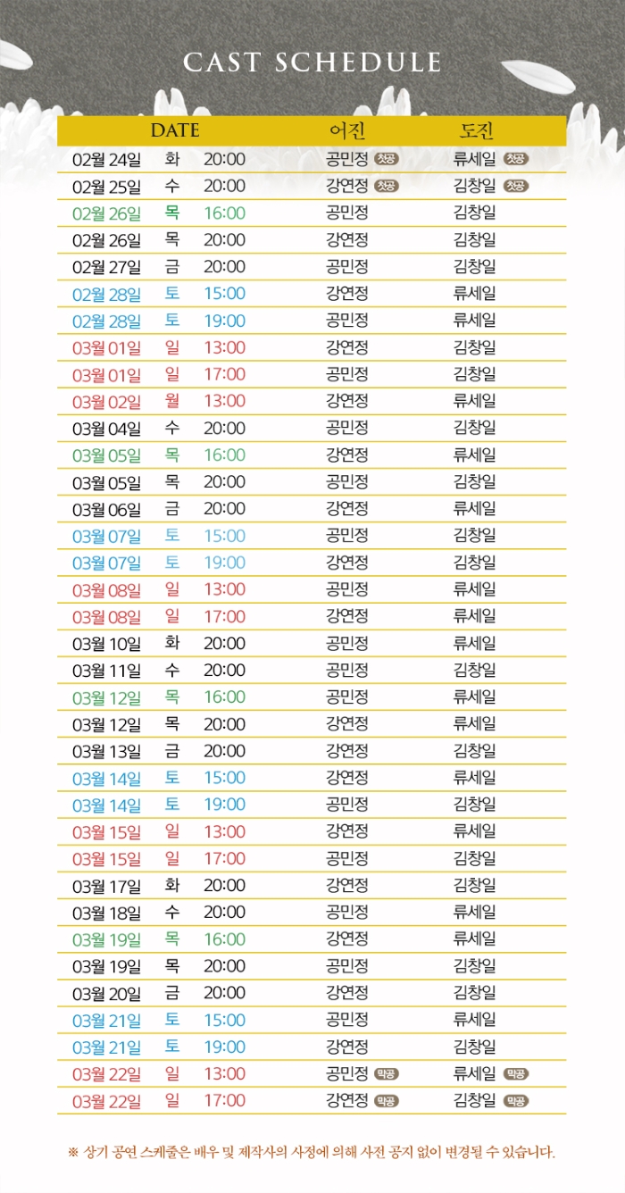 - 화, 수, 금 오후 8시 / 목 4시, 8시 / 토 3시, 7시 / 일, 공휴일 1시, 5시 (월 공연 없음)