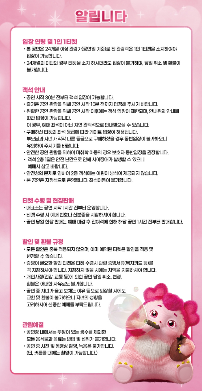 ※ 좌석배정은 회차별로 상이하며 당일 잔여석에서 예매선착순으로 배정됩니다. (좌석 지정 불가)