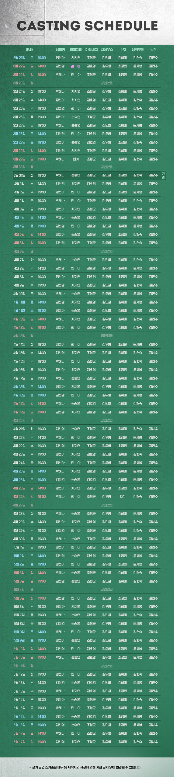 - 화, 목, 금 오후 7시30분 / 수 2시30분 7시30분 / 토, 일 2시, 7시 (월 공연 없음)