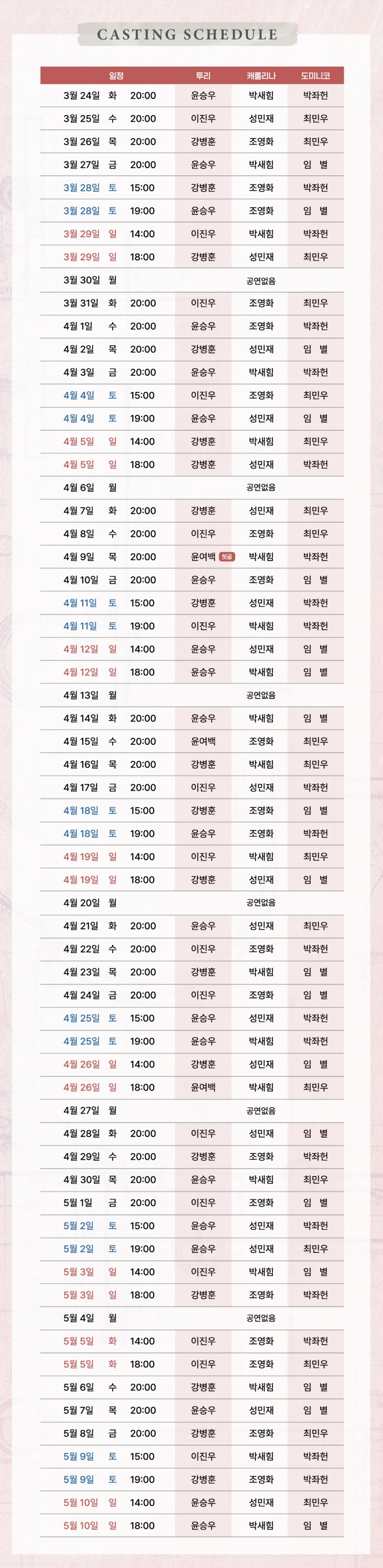 - 화~금 오후 8시 / 토 3시, 7시 / 일 및 공휴일 2시, 6시 (월 공연없음)